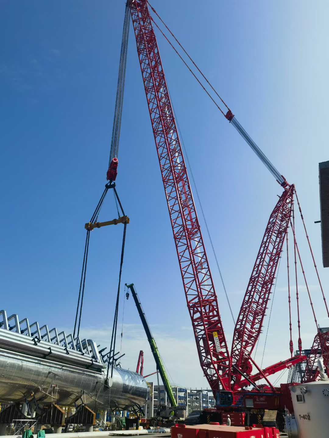本次吊装的吸收塔设备自重400吨,加上附件等吊装重量重达480吨,直径5.2米,高度58.54米,是本项目最高,最重的设备。吊装使用1350吨履带吊,溜尾500吨履带吊,耗时一个月的时间穿衣带帽,于9月17日成功吊装,达到了塔起灯亮的效果。