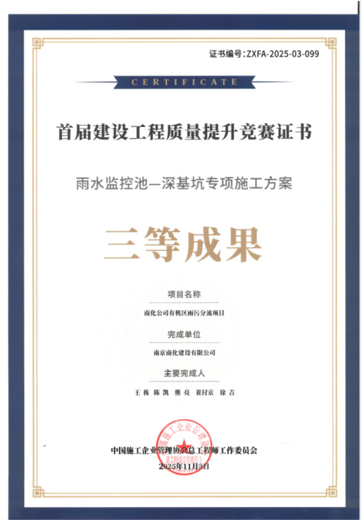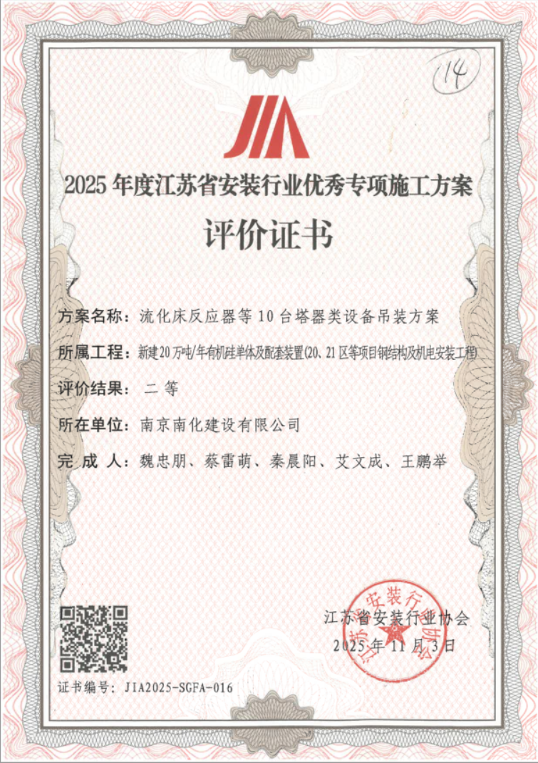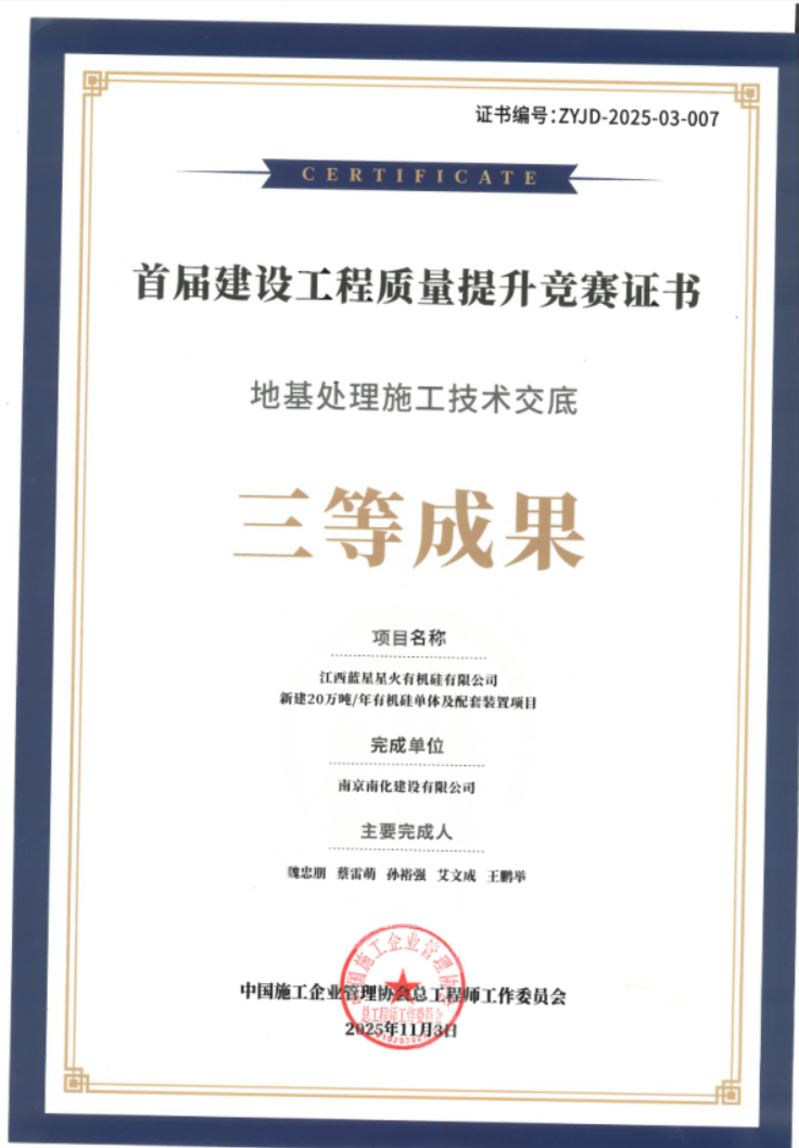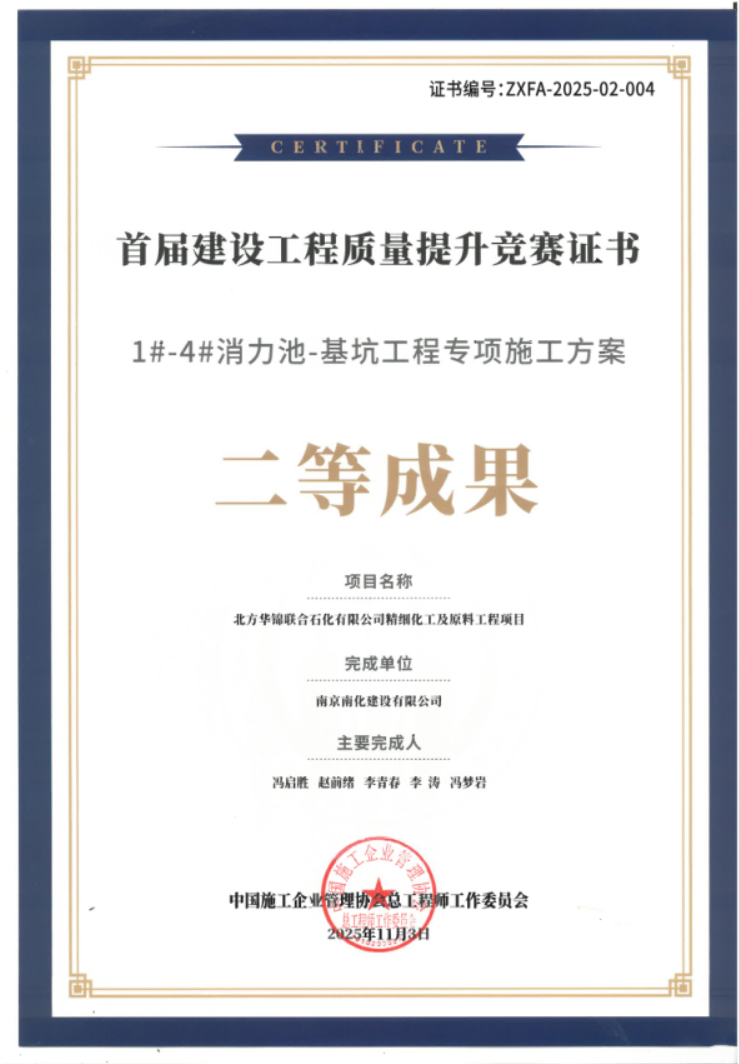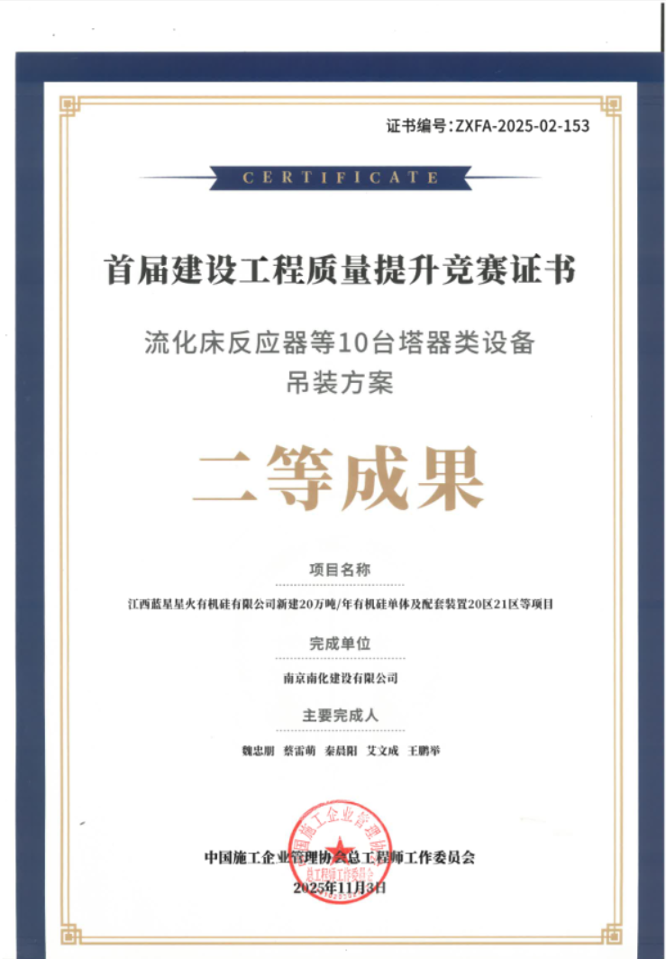 此次获奖成果亮点突出,多项目技术方案与交底凭借专业性、实用性脱颖而出:其一,新建20万吨/年有机硅单体及配套装置项目《流化床反应器等10台塔器类设备吊装方案》表现亮眼,既斩获中国施工企业管理协会竞赛二等奖,又获评江苏省安装行业协会优秀专项施工方案二等奖,获国、省级协会行业双荣誉,技术水准获跨层级认可;其二,北方华锦联合石化有限公司精细化工及原料工程项目《1#-4#消力池-基坑工程专项施工方案》、南化公司有机区雨污分流项目《雨水监控池-深基坑专项施工方案》,凭借科学的施工规划与严谨的风险管控设计,分别拿下竞赛二等奖、三等奖;其三,新建20万吨/年有机硅单体及配套装置项目《地基处理施工技术交底》,因内容详实、指导性强、交底形式多样,获评竞赛三等奖。此次获奖的方案与交底,贴合工程实际施工需求,可操作性强,为同类工程施工提供了技术参考与实践借鉴。