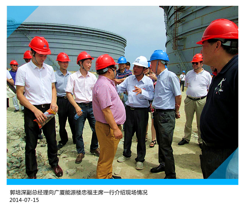 公司承接的广厦(舟山)能源集团黄泽山石油中转储运项目包含100万立方原油储罐和51万方成品油储罐及其配套附属设施。项目自2013年6月18日开工,至今已有1年多时间,现正处于建设高峰期,由于工程大,工期紧,对项目部在管理、人员调配上形成巨大挑战。项目部全体员工顶住压力、克服困难,在安全、进度、质量等方面取得了优异成绩。在历次省、市安全质量大检查中得到颇高赞誉,舟山市电视台等媒体多次前往施工进行现场采访报道。这次恰逢广厦集团成立30周年之际,董事局荣誉主席楼忠福、主席楼明携广厦子公司主要负责同志近200人亲临黄泽山施工现场视察指导。