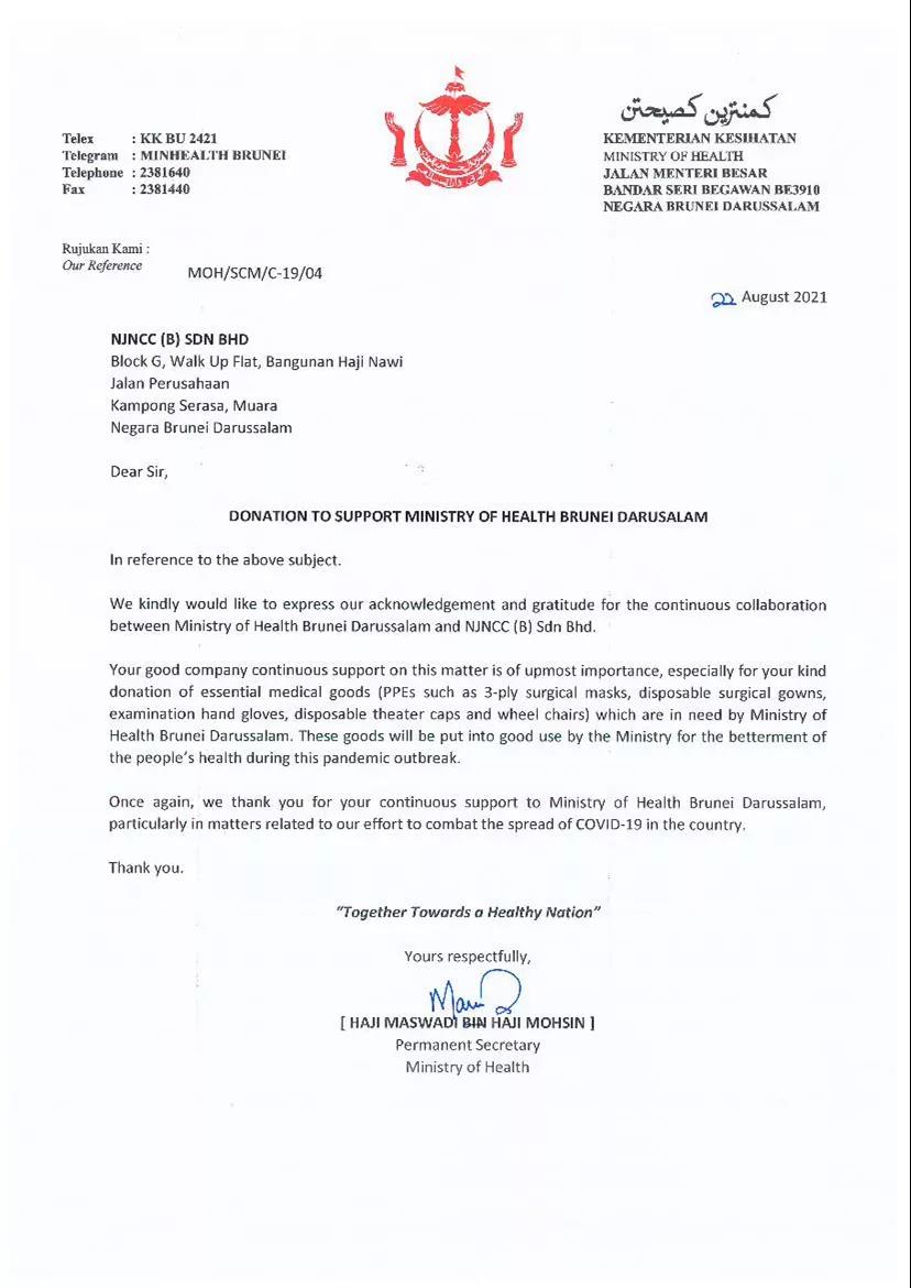 此次捐赠是继去年3月之后,公司第二次携手南京市外事办公室对文莱卫生部进行的一次捐赠。在市政府的关心支持下,公司第一时间进行有序采购,并调用自备库存,制定出详细的物资援助计划,紧急筹措一大批防疫物资,共同筹备了口罩91000只、医用防护服6000套、防护面罩5000个、检查手套10000副。该批物品运到文莱后,中国驻文大使代表捐赠方,文莱外交、内政、卫生三位部长代表接收方参加捐赠接收仪式。