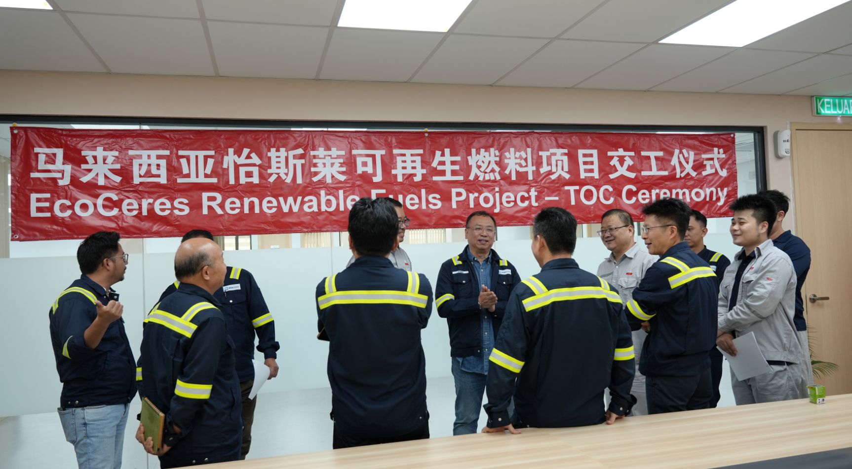 2025年12月19日14时30分,业主(Owner)EcoCeres、项目管理方(PMC)SJ 以及承包商(PCC)南化建(NCC)三方代表齐聚马来西亚,共同出席怡斯莱可再生燃料项目交工仪式。在庄重而热烈的氛围中,三方正式签署项目交接文件,标志着该项目建设阶段全面完成并顺利移交,项目取得圆满成功。