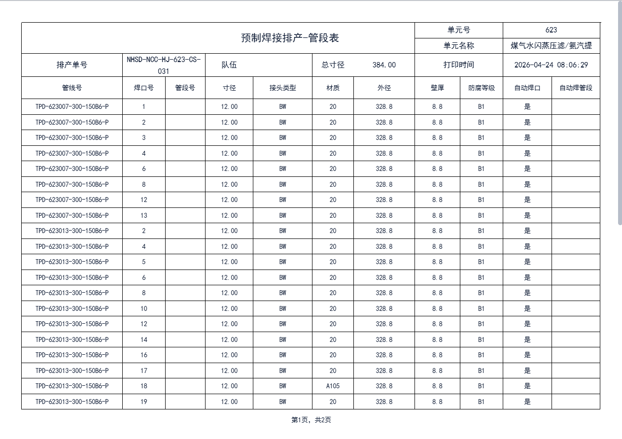 在生产环节,利用数字化管理平台整合排产、加工、检测等全链条数据,实现设备与人员的智能调度,保障“按需生产、无缝衔接”。工作人员通过移动终端扫码,即可即时获取管道的材质、规格、焊接参数等关键信息,确保操作精准规范。同时,为每根管段赋予唯一身份标识,从下料、焊接、检测到运输、安装,实现全生命周期的可视化管理与追踪,达成施工质量的全过程闭环管控。